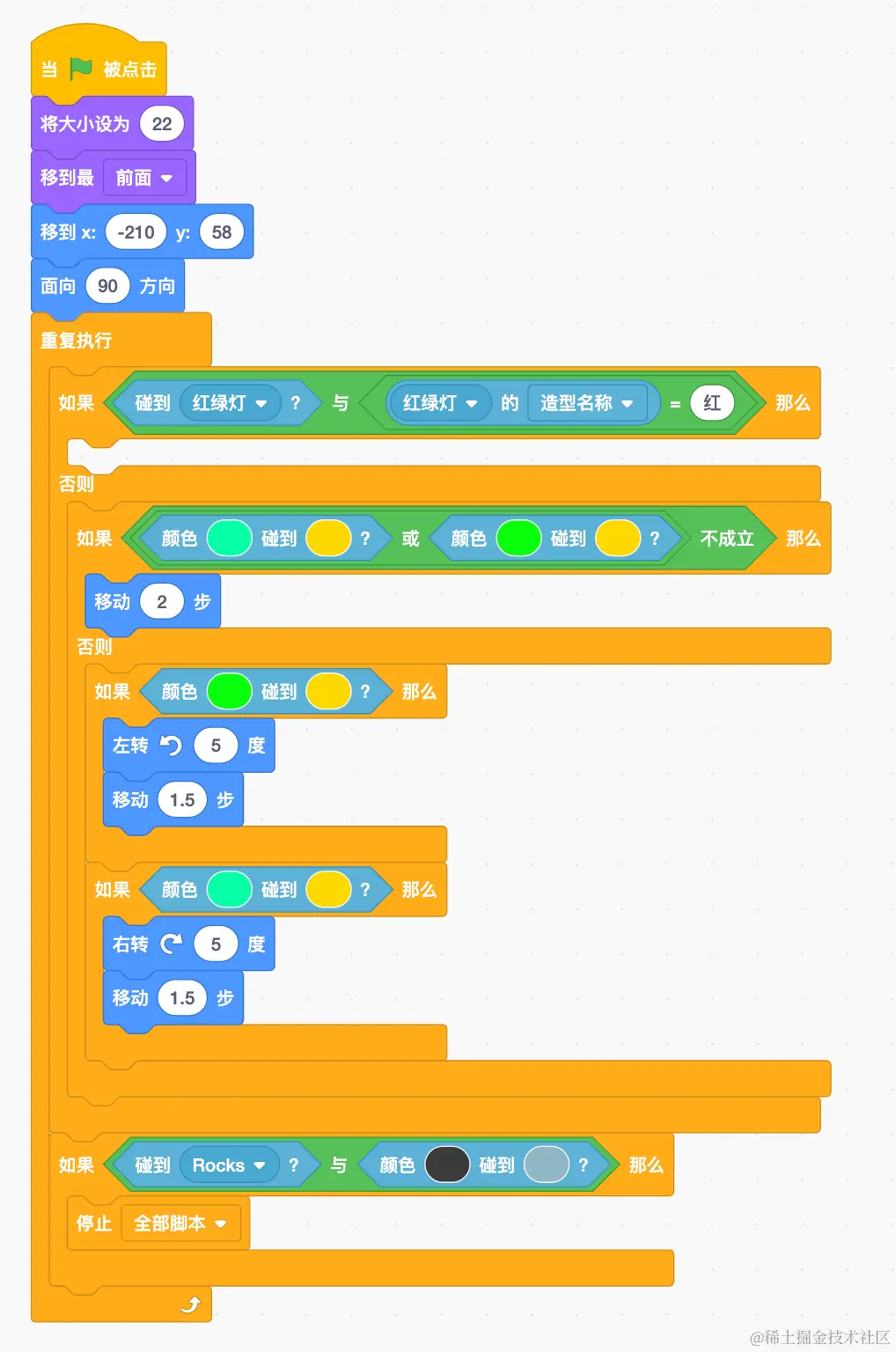 于是,到了21世纪,新一代的图形化编程概念开始接入,这一代语言最基本的雏形是 Scratch , Scratch是一种面向初学者,特别是儿童和青少年的图形化编程语言, 它允许用户通过拖拽编程块来完成编程的目的,这些编程块代表了传统编程语言中的代码结构,如循环、条件判断、变量等,每个块都代表一些编程命令,当它们被拼接在一起时,可以创建出可以执行的脚本。如下图所示: