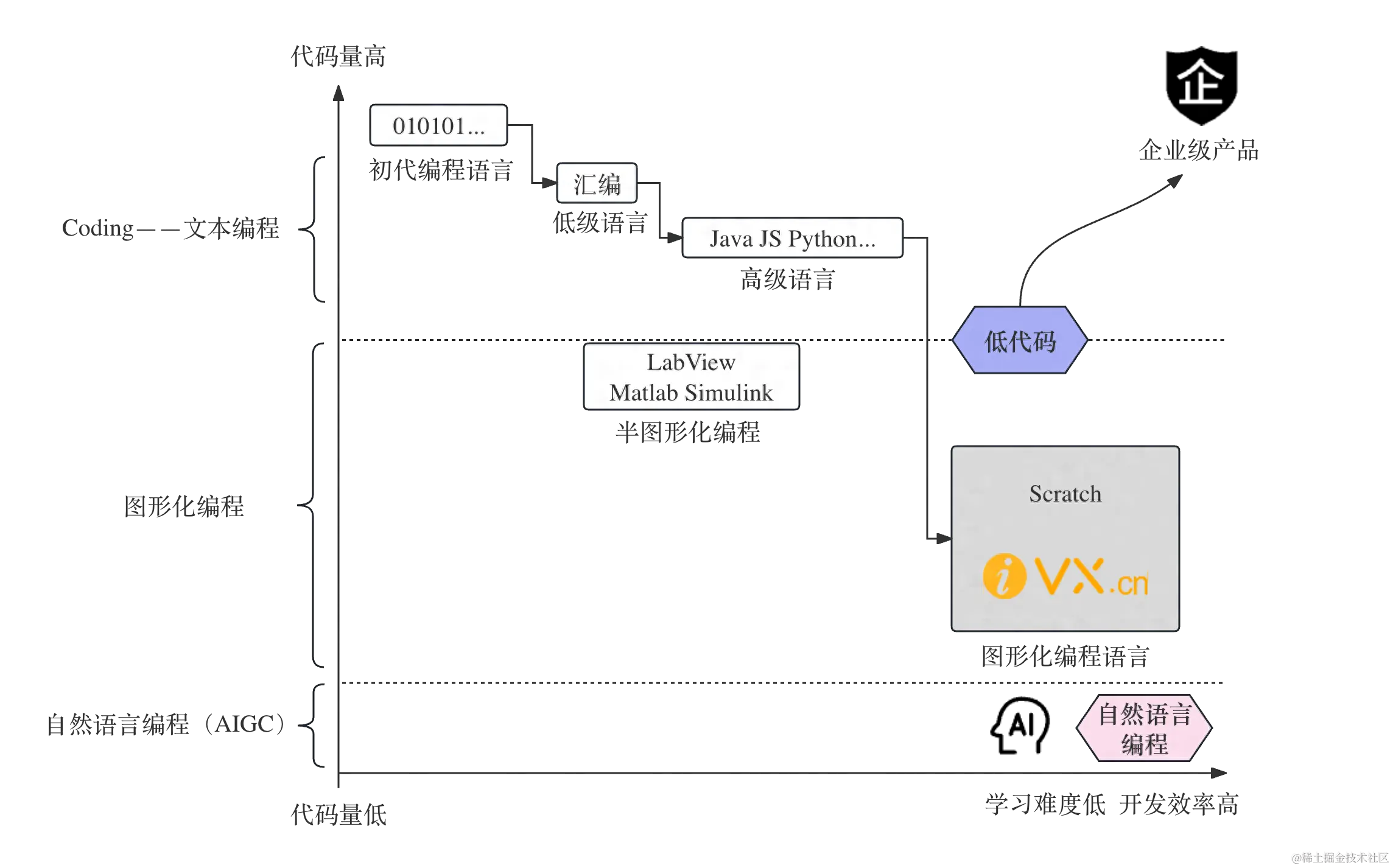 如图纵轴所示,我们可以简单地将现在流行的编程方式分为 3 种:文本编程、图形化编程、以及现在正在流行的自然语言编程。文本编程从最初代的 0101110 这种二进制模式,经过一代代程序大佬的改造,逐步从汇编的低级语言转向Java、C++、JavaScript、python、C#等这种适用于不同场景的高级语言。