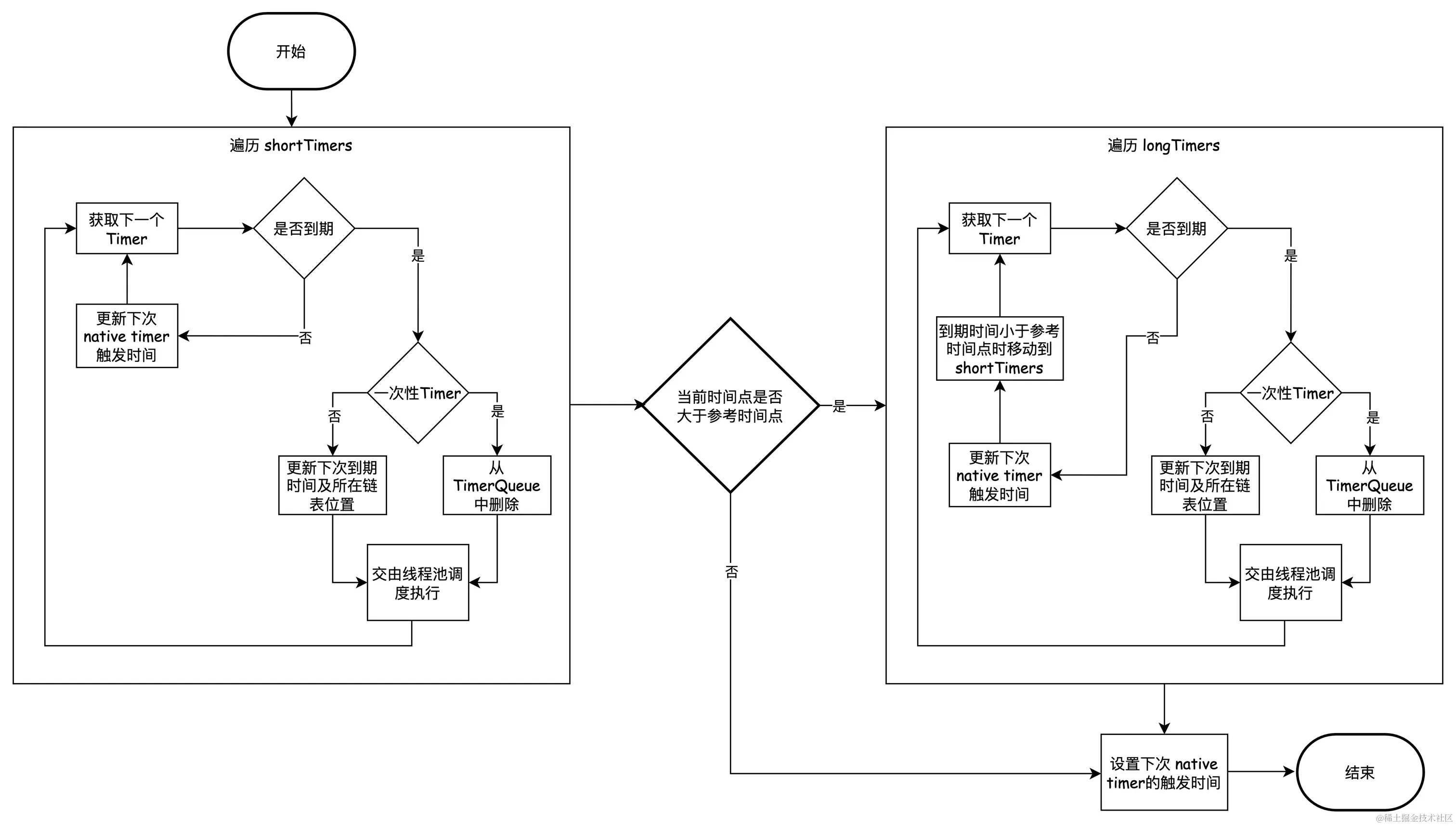 - TimerQueueTimer 已经到期了,就直接在这一次遍历中触发,流程和 shortTimers 一致。
