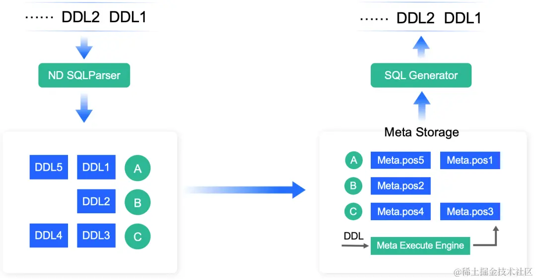 在做实时日志CDC的时候,其实要把数据正确解析出来,需要两个部分。以MySQL为例,你需要拿到数据库的binlog日志(里面包含数据前后镜像),同时拿到MySQL产生这条日志那一刻的表结构,才能正确地拼出响应的DML语句。因此在DML/DDL混合执行的时候,正确地拿到那一刻的表结构就比较困难,而这在生产库中经常遇见。因此NineData实现了一个DDLParser,将每一条DDL日志在同步模块中模拟MySQL的DDL执行,更新同步模块中的Meta缓存,并实现了版本化存储。这样就可以获得每张表任意时刻的表结构元数据。