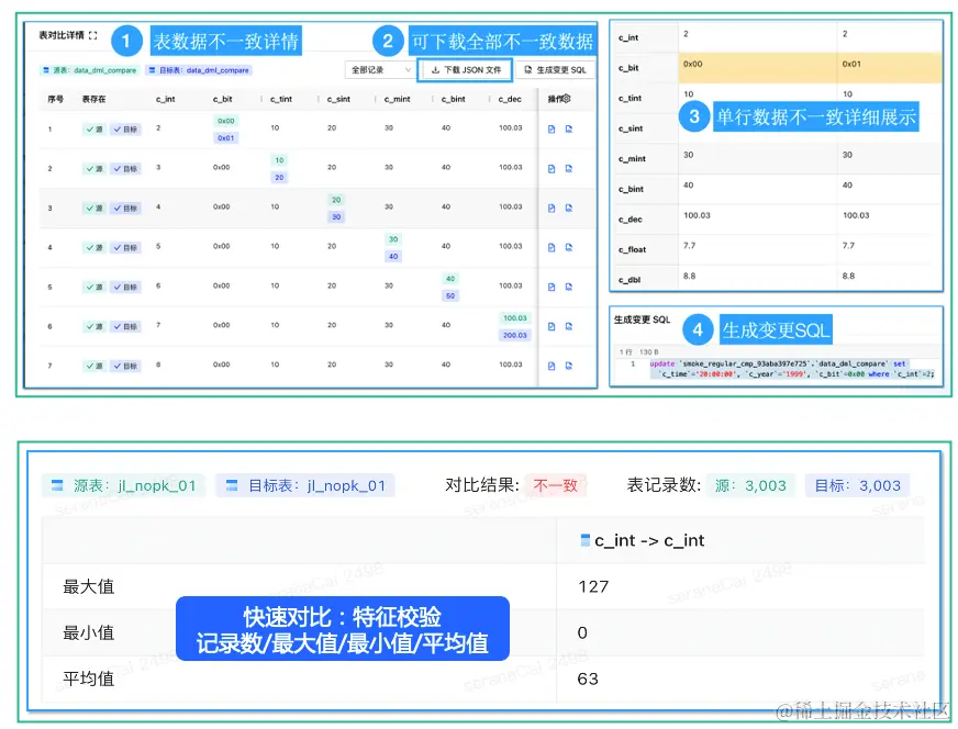 在结果呈现上,NineData会将每一行每个字段的不一致部分以颜色标记出来,并生成订正SQL。