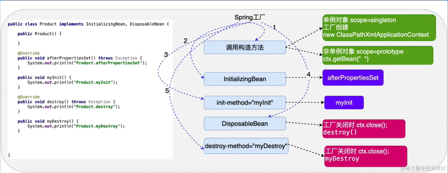 public void myInit(){ } // 在配置文件中 调用init-method 也可以实现初始化操作 <bean id="product" class="xxx.Product" init-method="mtInit" -