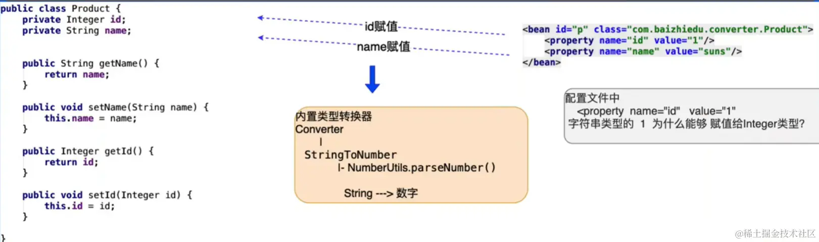 💡 作用:Spring通过类型转换器把配置文件中字符串类型的数据,转化成了对象中成员变量对应类型的数据,进而完成了注入2.自定义类型转换器