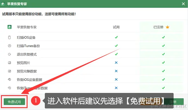 步骤1:移步数据蛙官网,在电脑上下载并安装数据蛙苹果恢复专家,打开软件后选择【免费试用】选项。