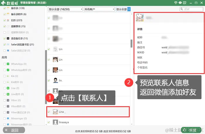 有时候我们可能会遇到这样的问题:在使用微信时,突然发现微信通讯录中一些重要的联系人不见了。那么,微信通讯录删除的联系人怎么找回?数据蛙苹果恢复专家这款软件可以深度扫描手机中的数据,并且支持多种数据类型的恢复,包括照片、视频、联系人等等。