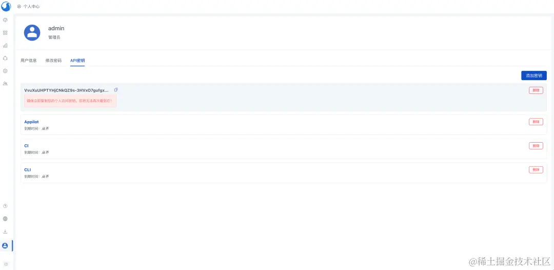 点击添加密钥 ,为密钥命名并设置过期时间。