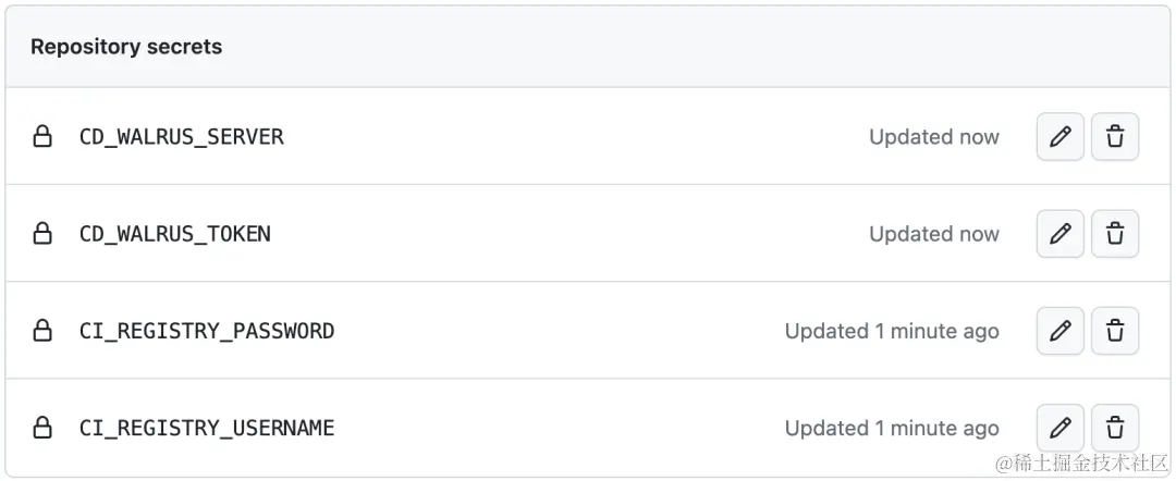 CI_REGISTRY_USERNAME、CI_REGISTRY_PASSWORD、CD_WALRUS_SERVER和CD_WALRUS_TOKEN。对于CD_WALRUS_SERVER,格式为https://domain:port/。这些变量将于 GitHub Actions 与镜像仓库、Walrus CLI 之间进行安全通信。
