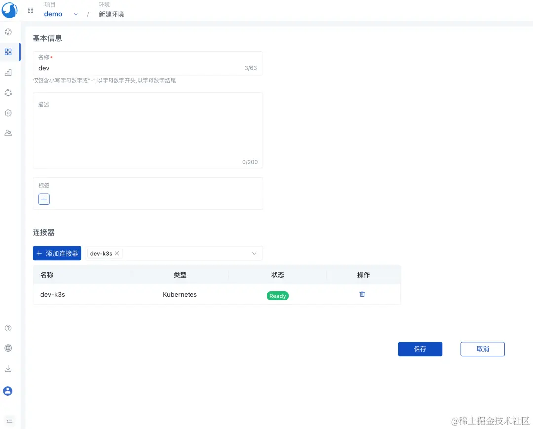 创建一个环境,并添加上面创建的 K8s 连接器。