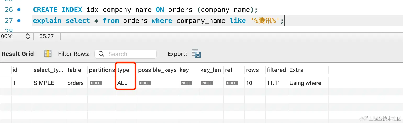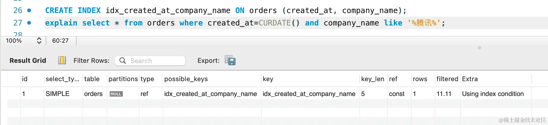 但是如果给created_at, company_name创建一个联合索引,那么执行where created_at=CURDATE() and company_name like '%腾讯%'就会走联合索引,并且company_name like '%腾讯%'就会利用到索引条件下推机制,比如下图中Extra里的Using index condition就表示利用了索引条件下推。