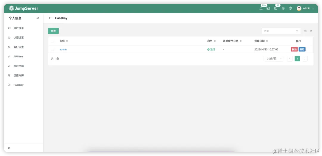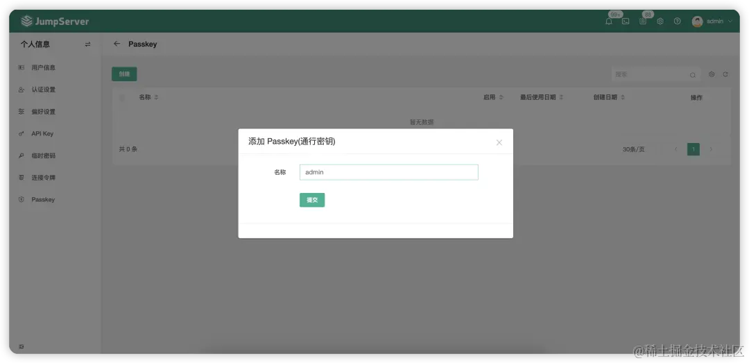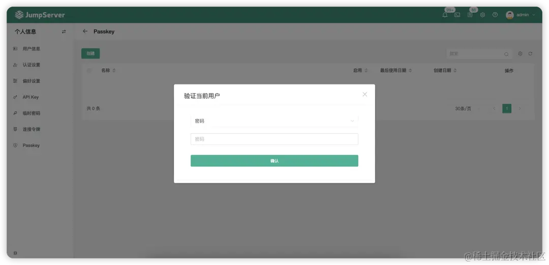 第一步: 选择“个人信息”→“Passkey”,点击“创建”按钮,添加Passkey通行密钥。创建时,用户需要密码或更高级别的验证方式进行校验;