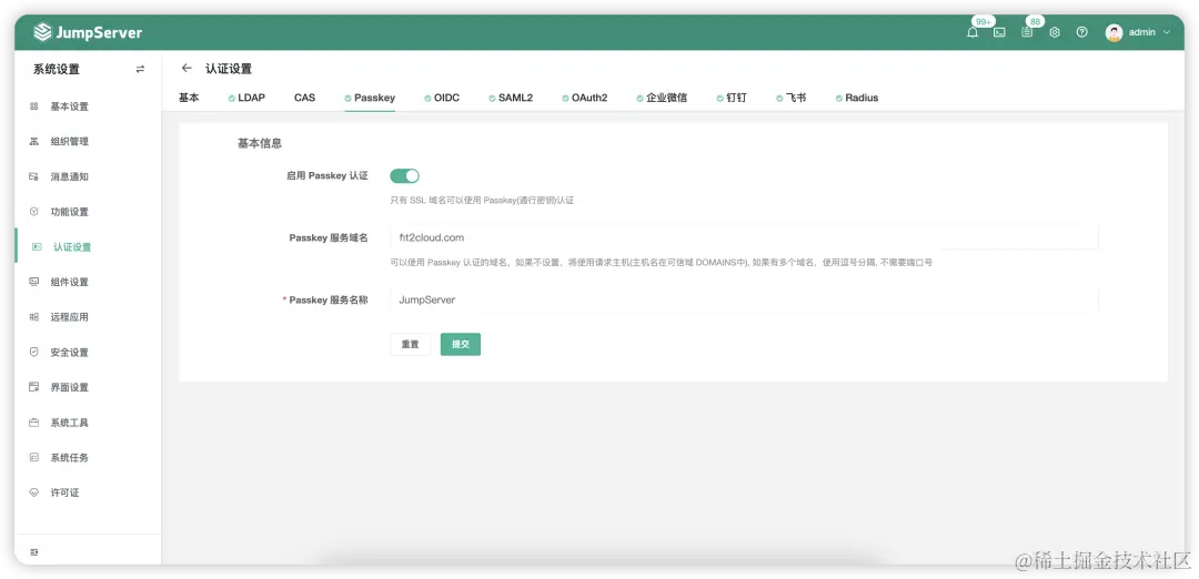 第一步: 在JumpServer中选择“系统设置”→“认证设置”,开启“启用Passkey认证”按钮;