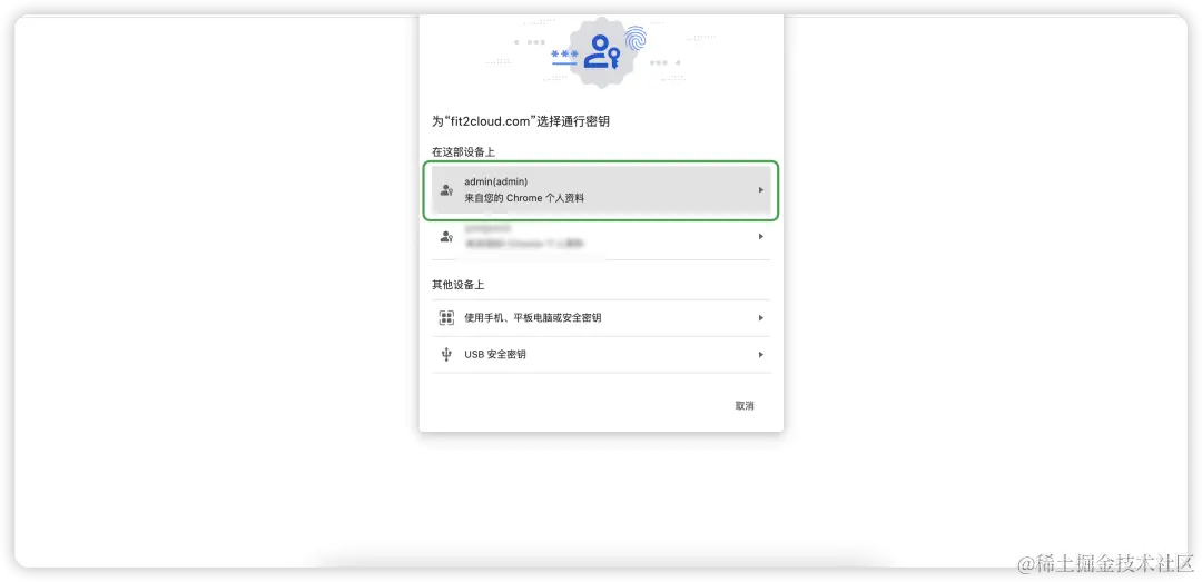 以通过用户当前设备创建通行密钥方式为例,选择保存“在这部设备上”的密钥账户,如admin: