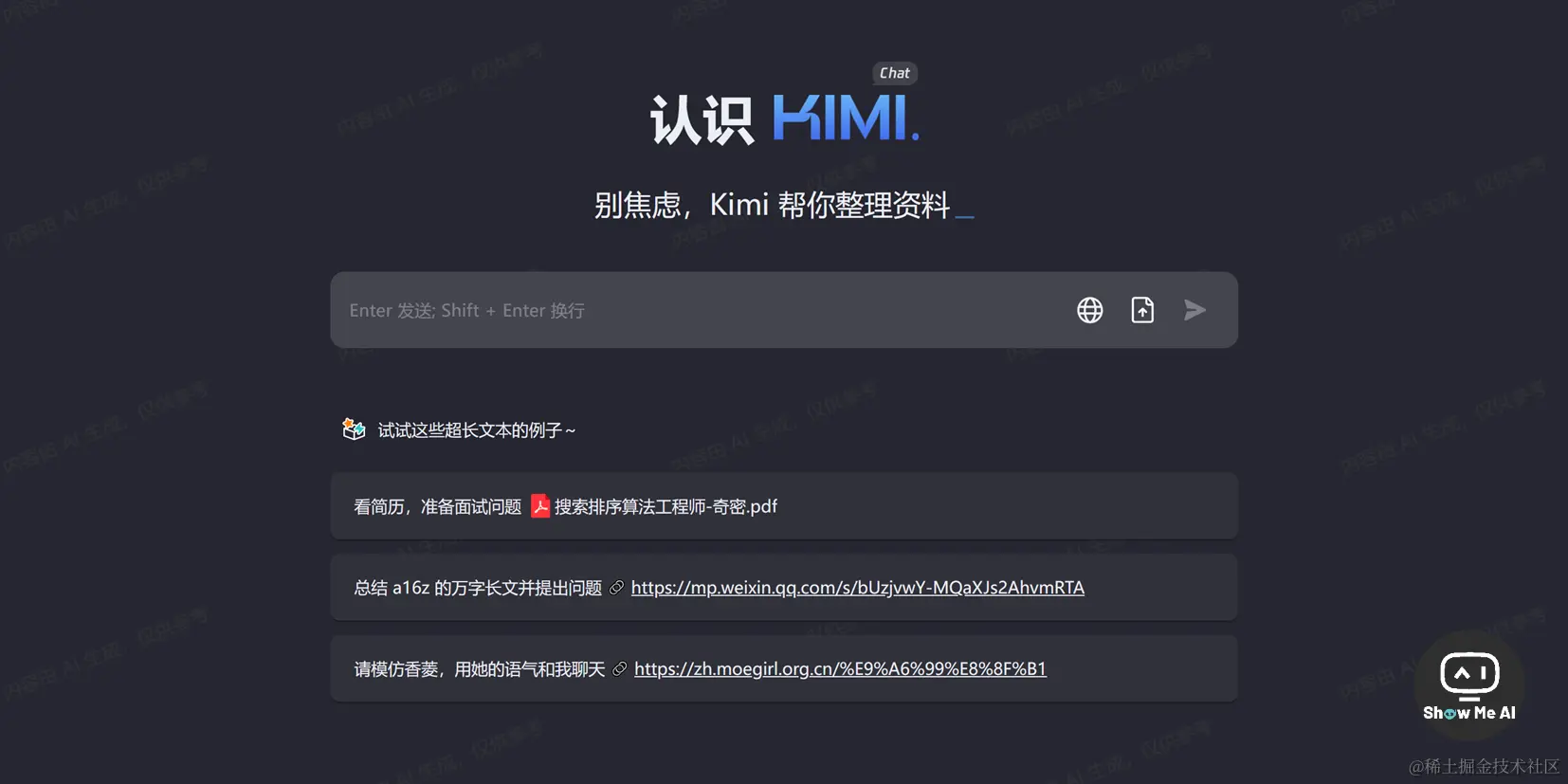 Kimi 是由 Moonshot (月之暗面) 推出的智能对话助手,支持输入长达 20 万汉字的上下文 (可以当作 Claude 的国内同类型替代产品,好用)。