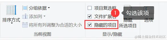 第2步:勾选上【隐藏的项目】,然后再查看文件是否出现。