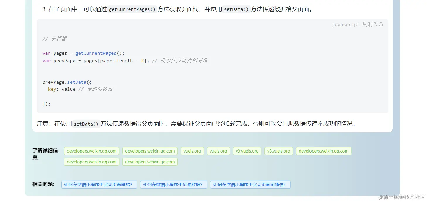 注意:在使用setData()方法传递数据给父页面时,需要保证父页面已经加载完成,否则可能会出现数据传递不成功的情况。
