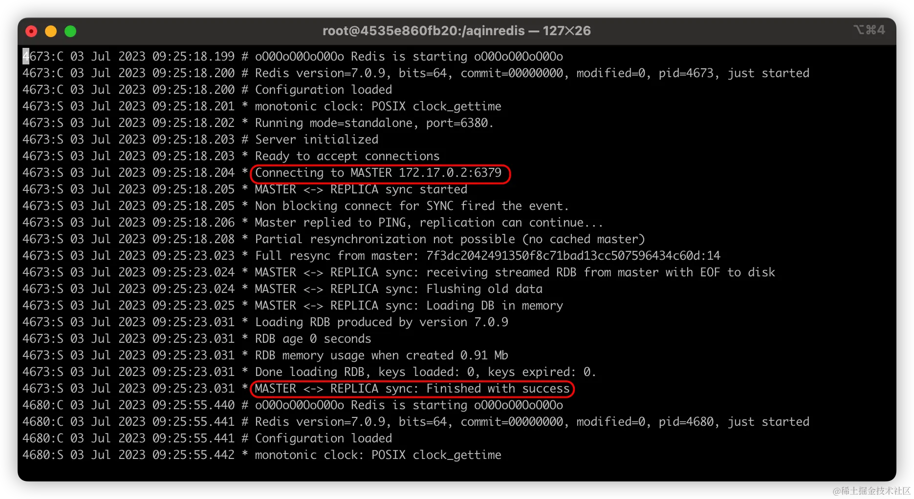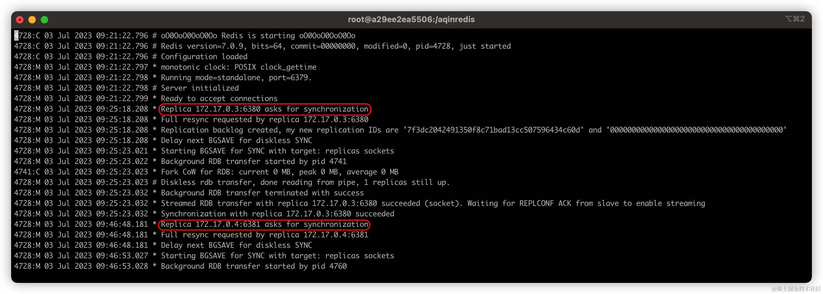 我们查看下主机的日志(就是一开始配置文件redis.conf中设置的log文件),可以发现,已经记录了两台从机挂到主机上的日志了