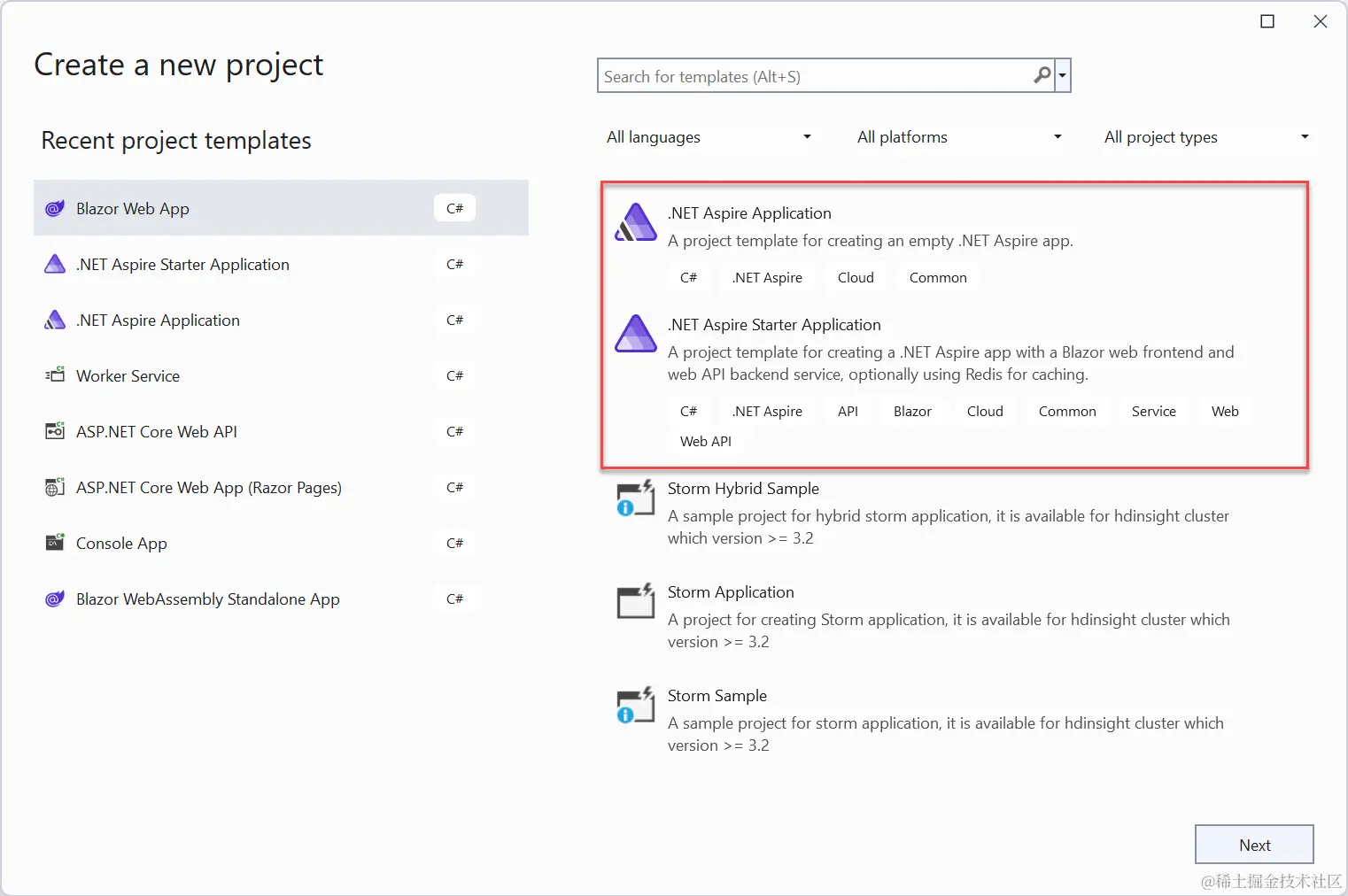 在对话框窗口中,搜索Aspire并选择.NET Aspire Starter Application。选择下一步。