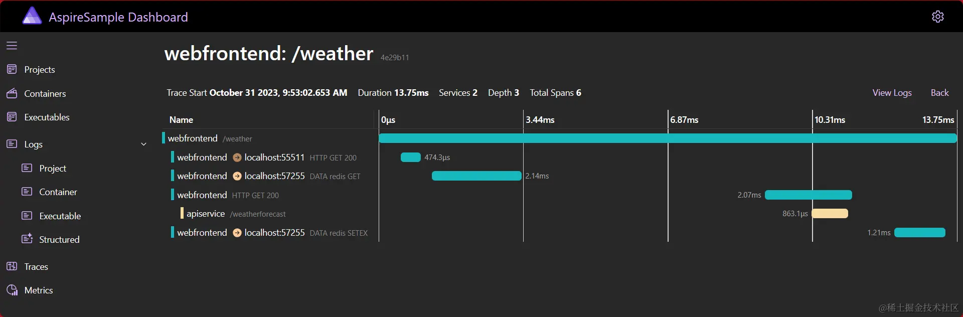 Traces:显示应用程序的跟踪,它可以跟踪通过您的应用程序的请求路径。找到/weather的请求,然后选择页面右侧的“查看” 。当请求穿过应用程序的不同部分时,仪表板应分阶段显示请求。