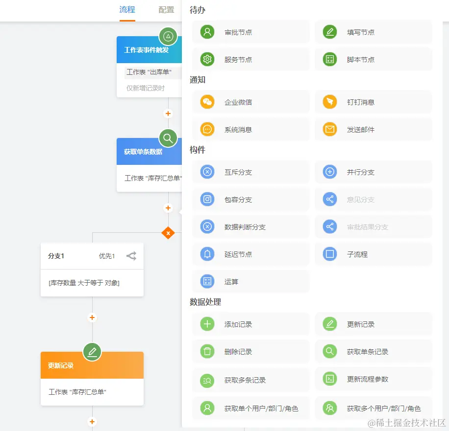 敲敲云有25种流程节点,包含审批、多种数据处理、多种分支条件、函数计算、子流程等等。