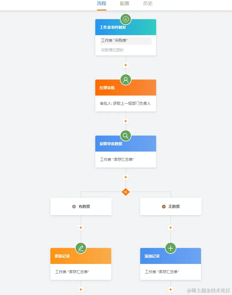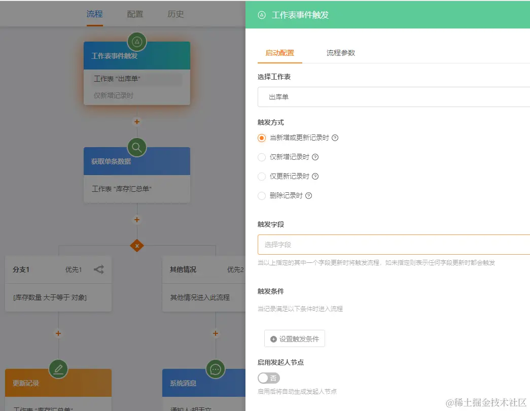 当表单新增或更新时、仅新增记录时、仅更新记录时以及删除记录时都可以触发不同的流程。每种触发方式还可以根据不同条件设定,触发不同流程,以满足更复杂的业务场景。