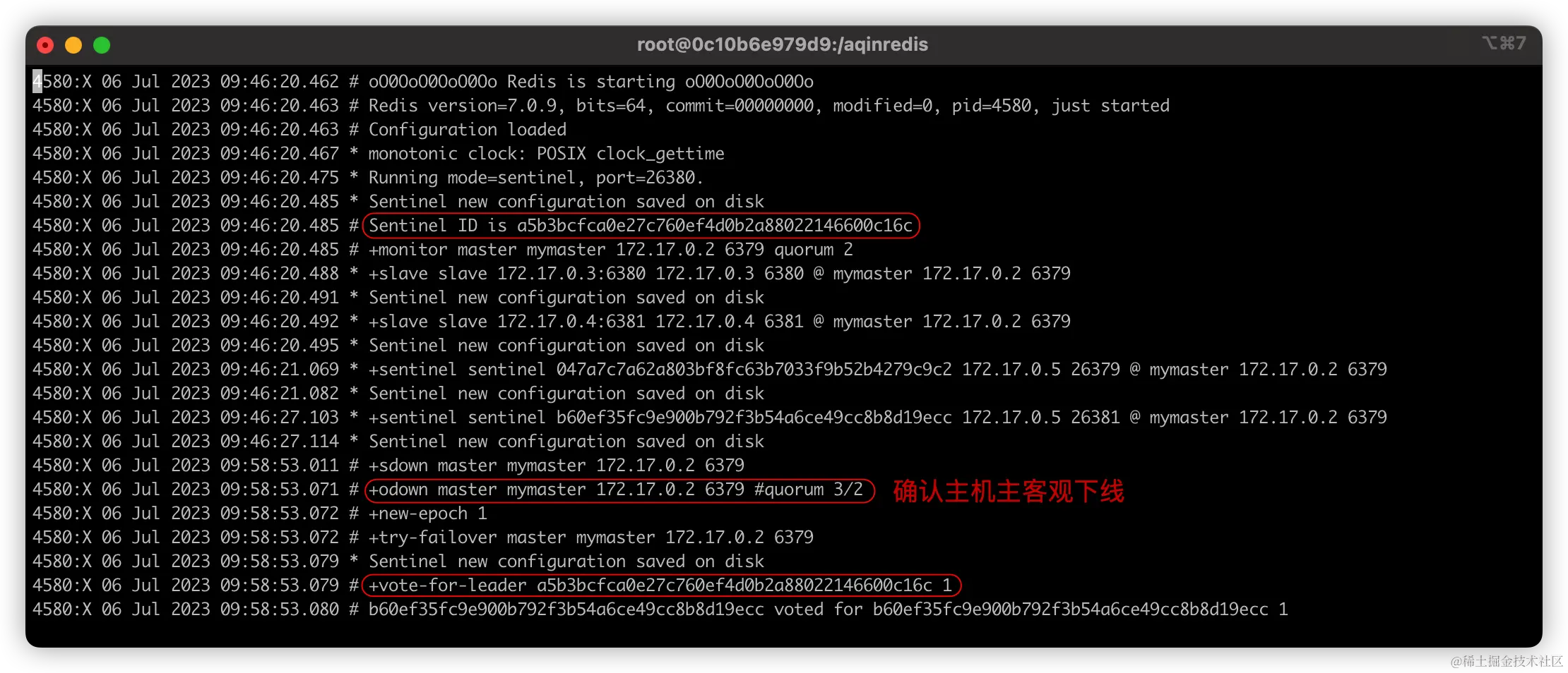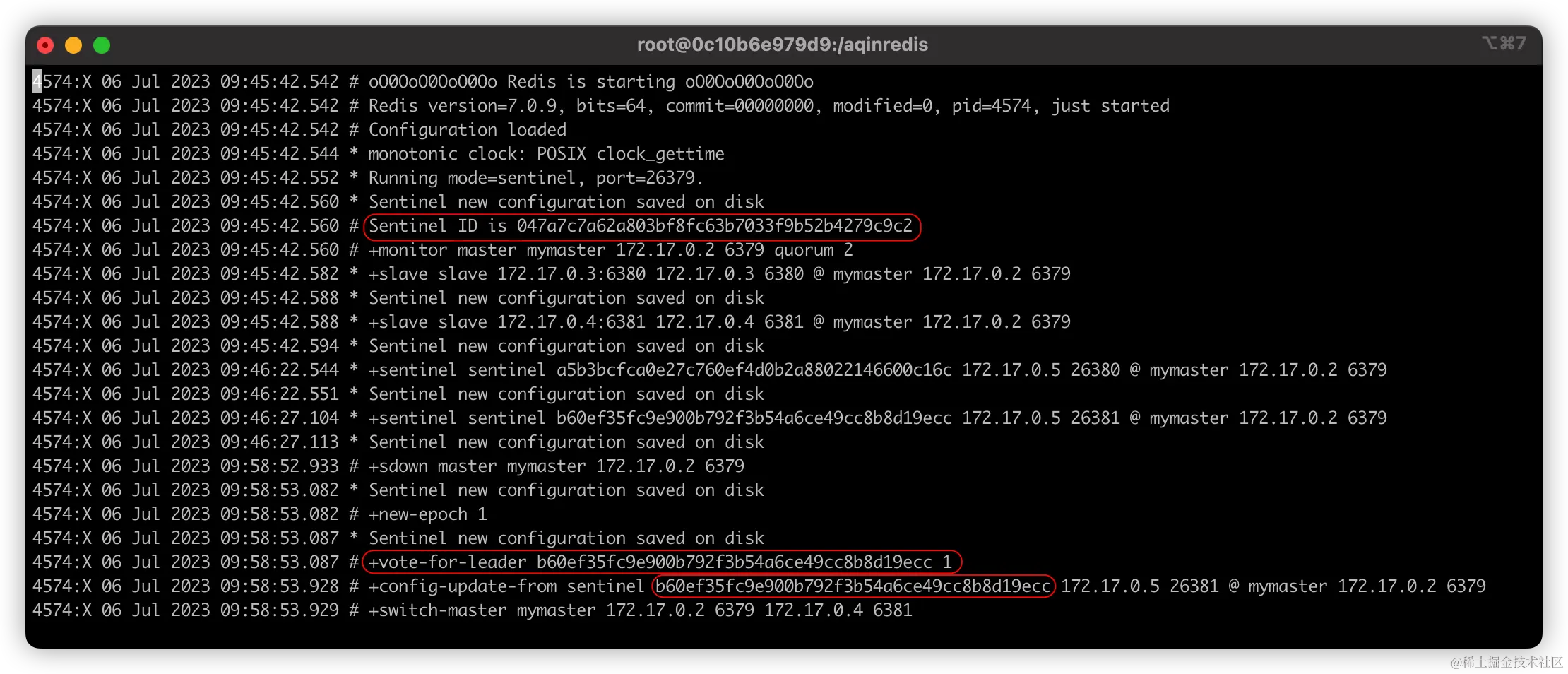 由sentinel26380.log可以看到,sentinel26380的ID是a5b3bcfca0e27c760ef4d0b2a88022146600c16c,他把票投给了他自己