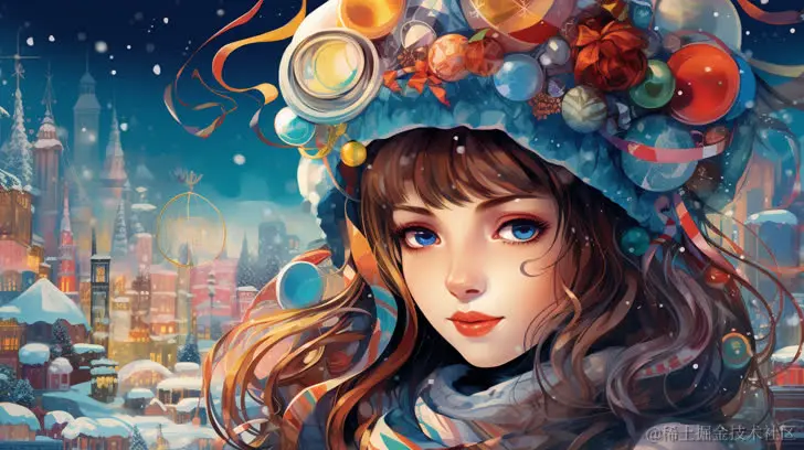 (beautiful girl) in front of a background with christmas ornaments are decorated to appear as a village, snow and holiday, in the style of graphic design-inspired illustrations, holographic, interactive pieces, m42 mount, kitsch and camp charm, digital print, dreamlike illustrations