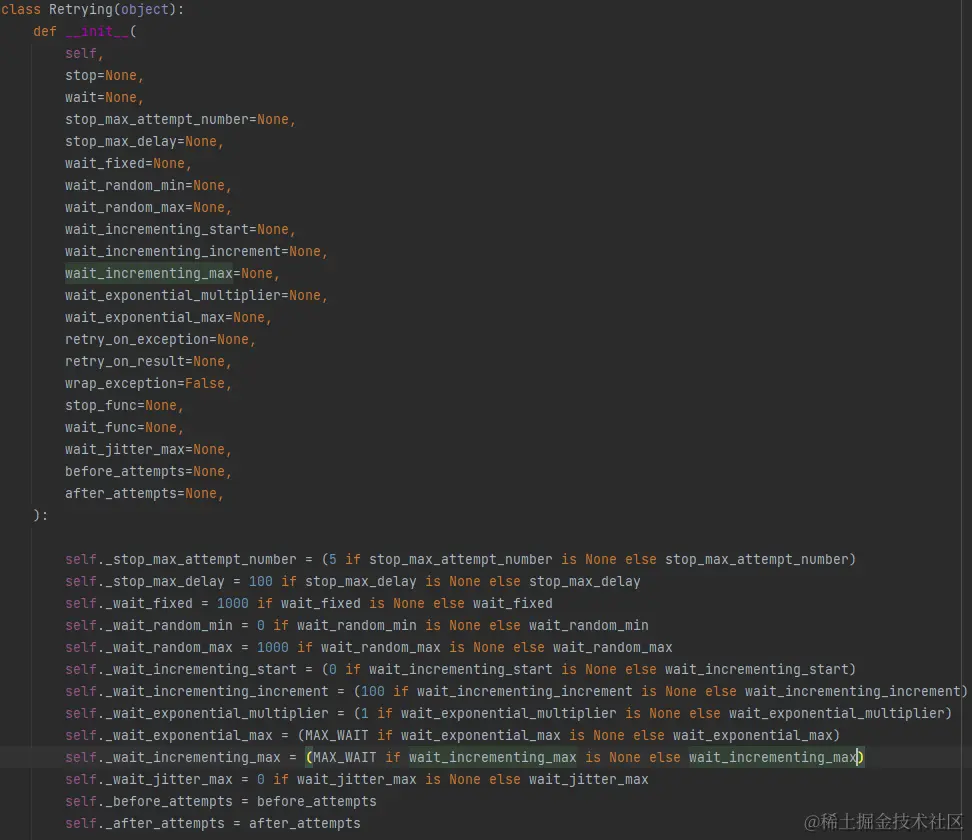 - wait_exponential_multiplier和wait_exponential_max:以指数的形式产生两次「retrying」之间的停留时间,产生的值为2^previous_attempt_number * wait_exponential_multiplier,previous_attempt_number是前面已经「retry」的次数,如果产生的这个值超过了wait_exponential_max的大小,那么之后两个「retrying」之间的停留值都为wait_exponential_max