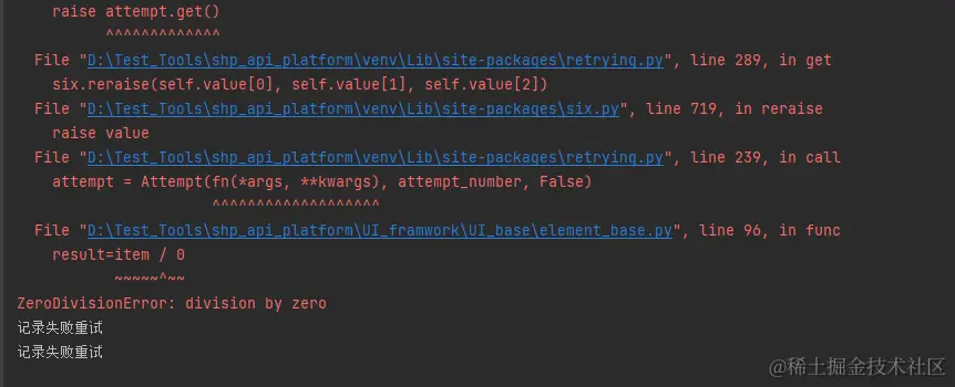 因为这里我们指定了失败后进行两次重试,如果重试执行两次后还是报错则结束重试,将错误信息抛出来。
