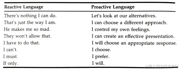 为了主动行动,我们需要聆听我们的语言,我们的语言是一个非常真实的指标,表明我们在多大程度上认为自己是积极主动的人。反应性的人使用语言来免除自己的责任。反应性语言也能成为自我实现的预言。