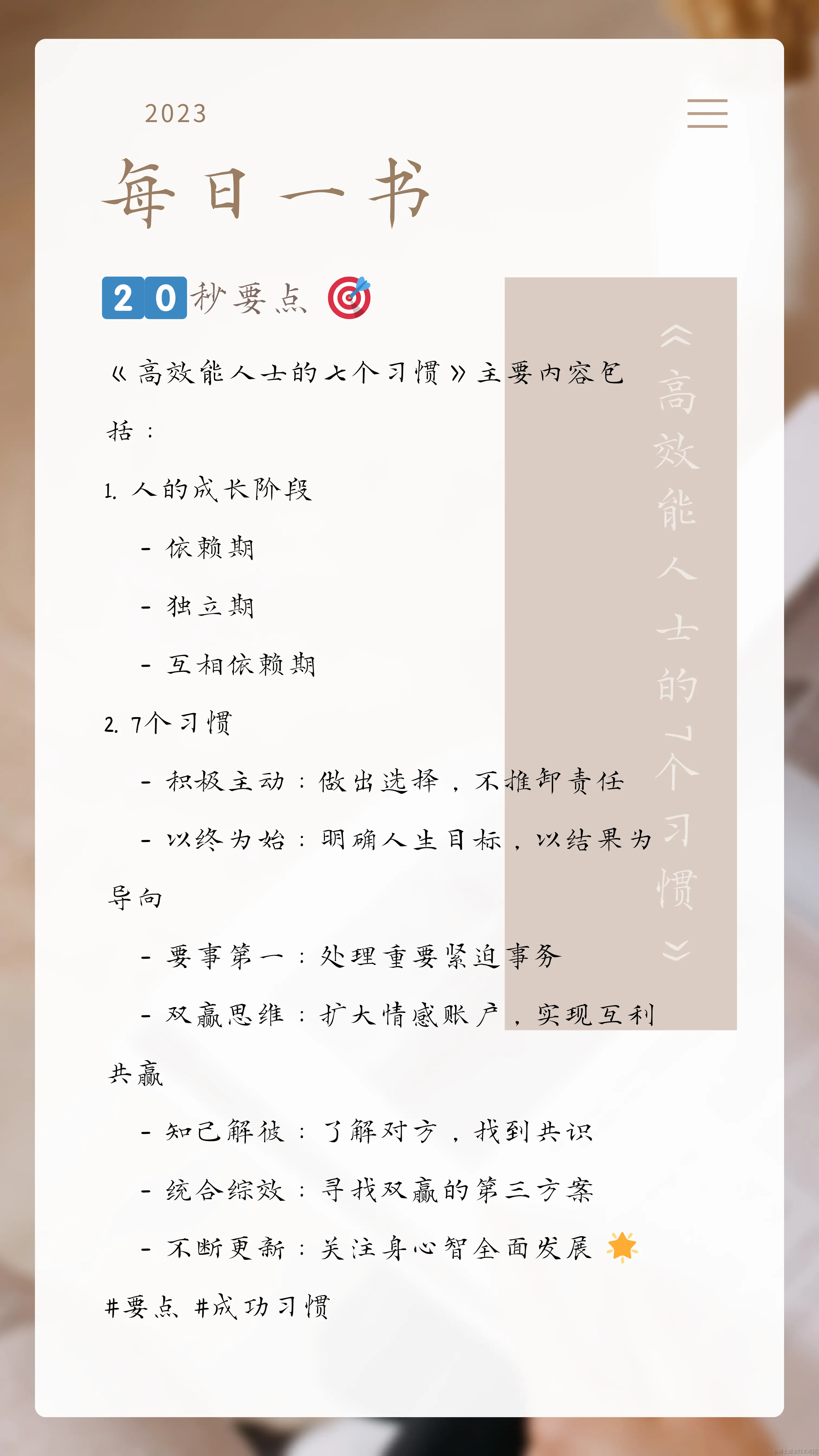 - 科维认为,培养有效习惯需要一个范式的转变——具体来说,就是从匮乏和受害者心态转变为丰富和责任心态。