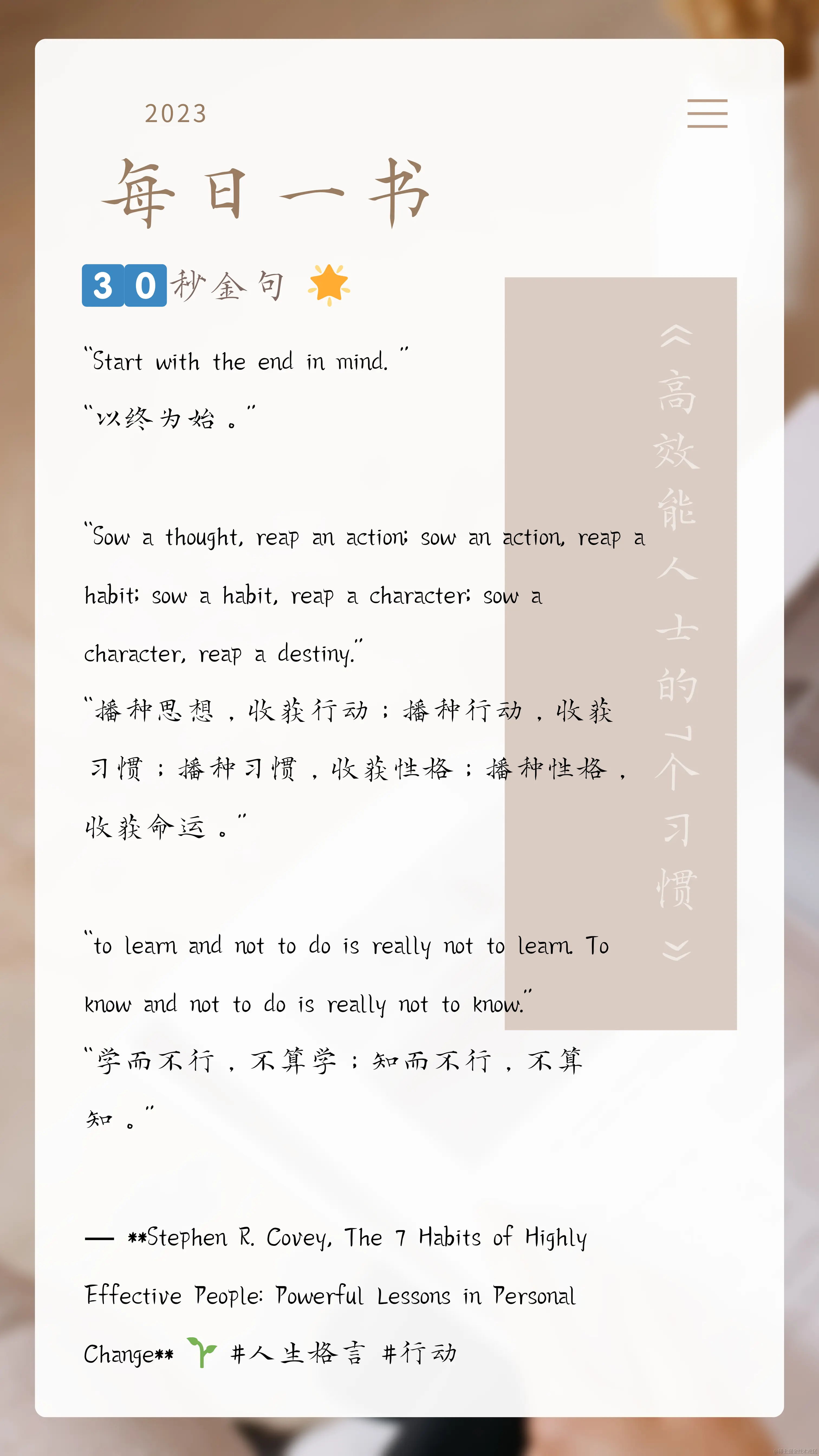 科维邀请我们想象自己的葬礼。你希望被人们怎样记住?你希望你的朋友和家人对你说些什么?以终为始意味着明确我们的目标和价值观以指导我们的行动。