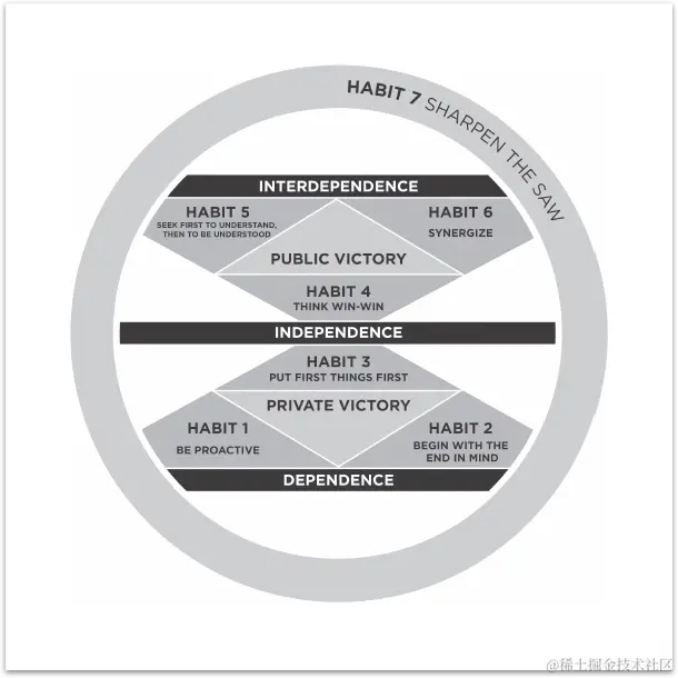 这7个习惯被分为3个类别:独立期(习惯1-3)、合作期(习惯4-6)和不断更新期(习惯7)。我们先概述一下,然后讨论每类习惯。