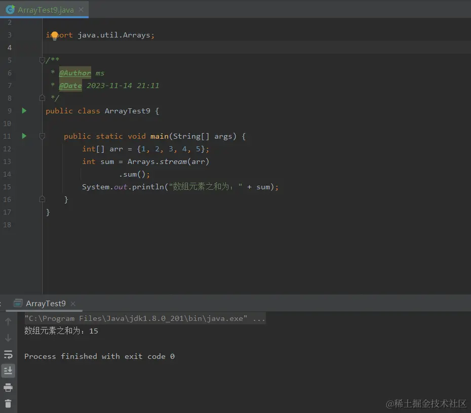 该代码定义了一个类ArrayTest9,其中运用了Java.util.Arrays类中的stream方法和sum方法来计算一个int型数组arr中所有元素的和,并将结果输出。
