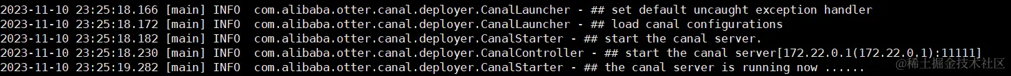 启动成功日志信息,logs/canal/canal.log