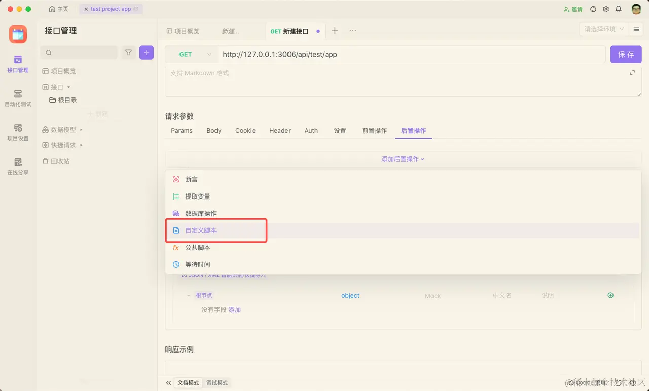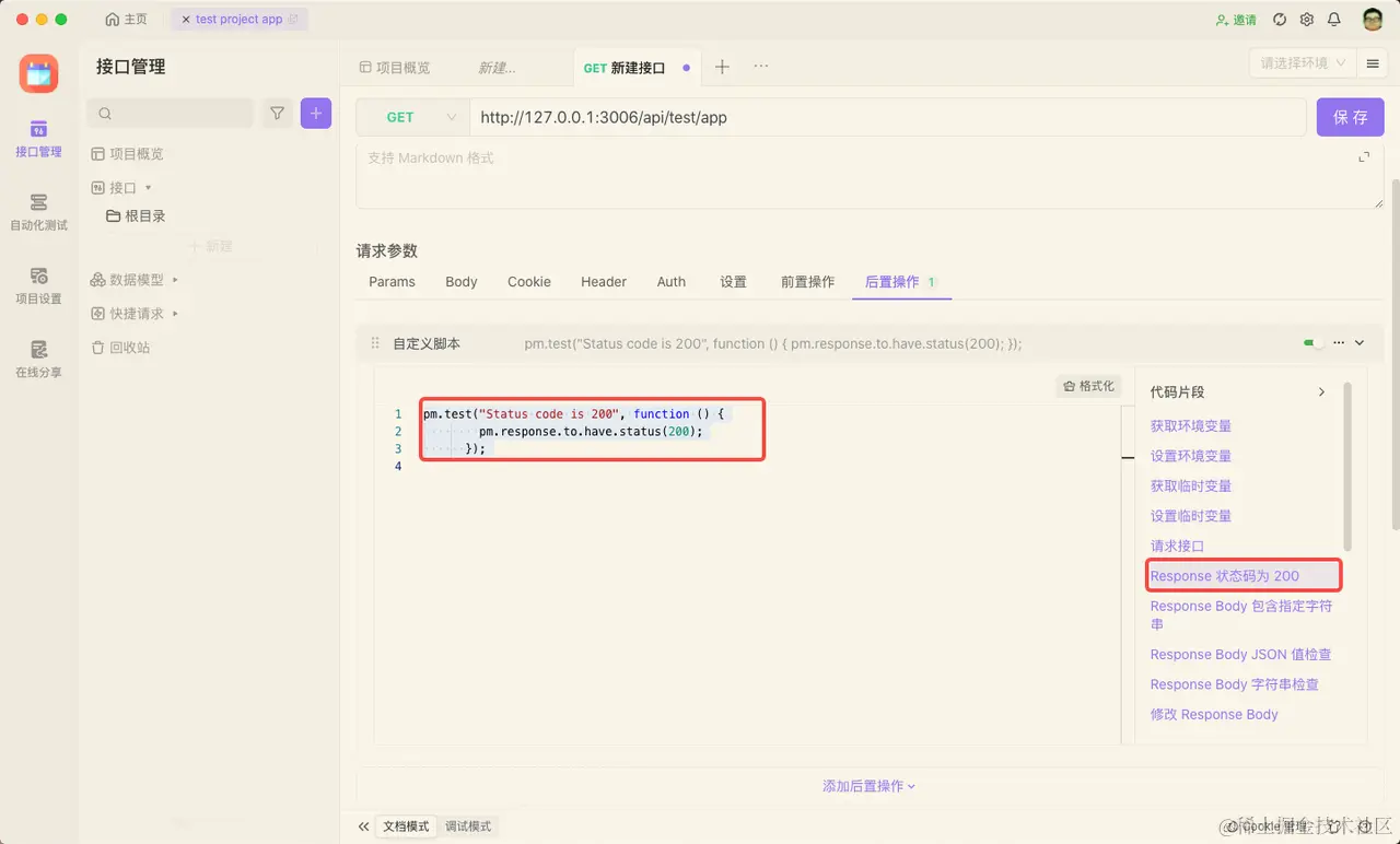 Apifox 已经为我们提供了现成的脚本语句,我这里想要判断返回的 status code 是否为 200。