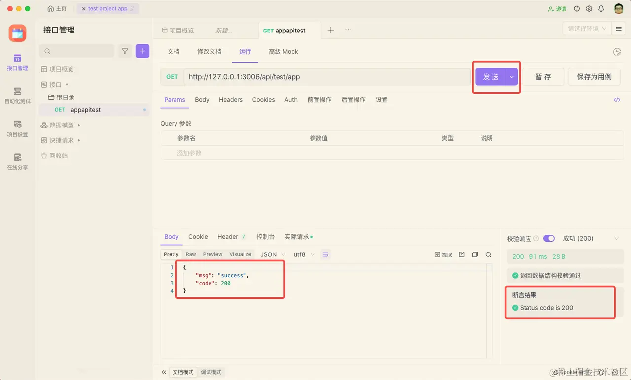 到运行页,点击发送按钮,则可得到响应,以及断言结果。