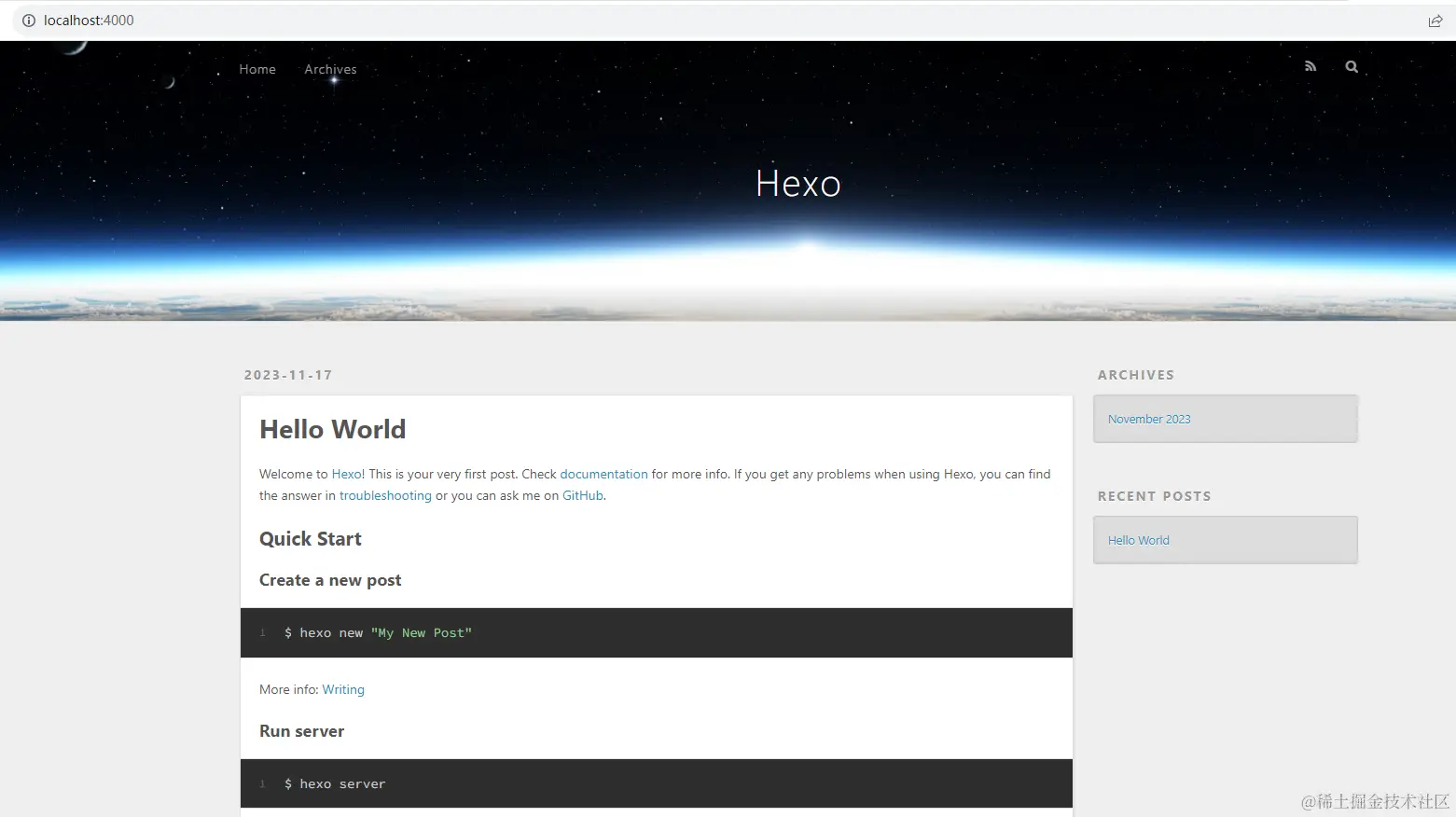 访问 http://localhost:4000/ 地址效果如下,这是 hexo 默认的主题效果,一个博客的基本雏形已经有了