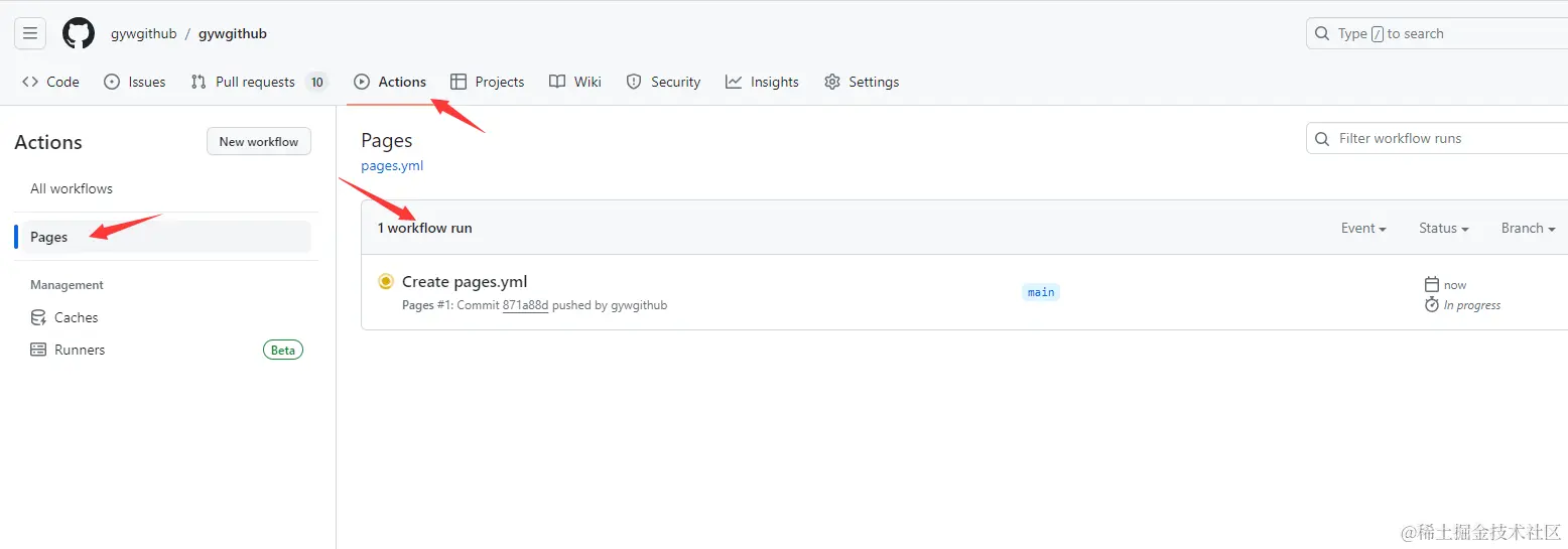 添加 pages.yml 文件成功后,在 Actions 选项中会有对应的工作流运行起来