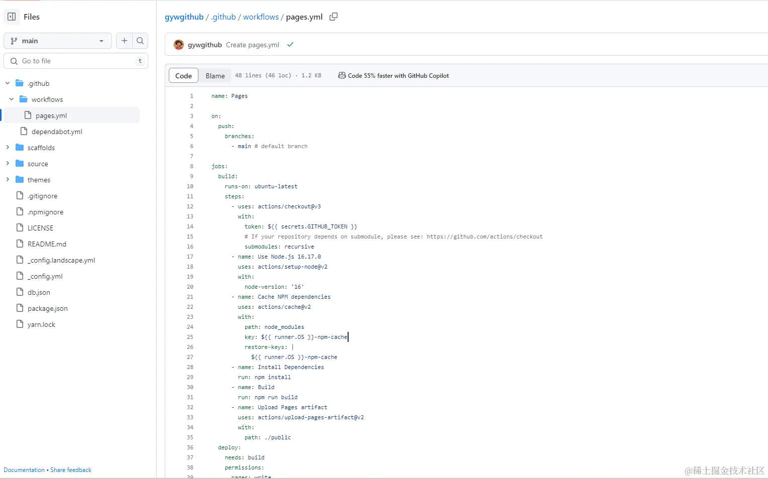 创建 pages.yml 部署流程文件,直接把 官方的配置 复制过来