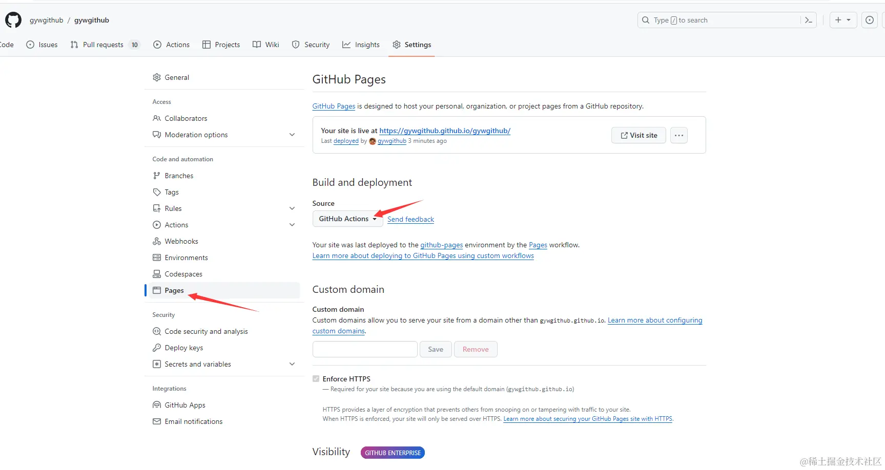 Settings > Pages > Source 选择 GitHub Actions , 然后点击 create your own