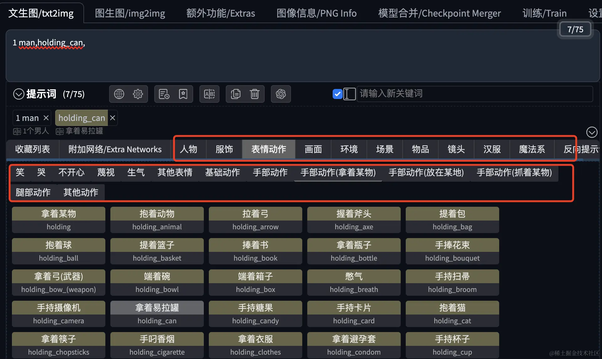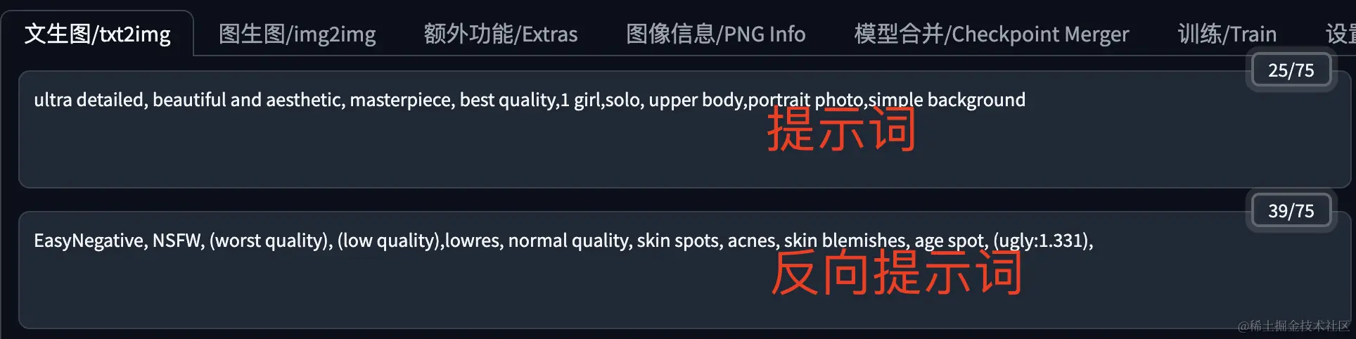 在提示词输入框的右上角,我们可以看到当前已经输入的Token数量和限制的最大Token数量。在基本的Stable Diffusion v1 模型中,该限制是75 个tokens。不过在 Stable Diffusion WebUI 中,你可以写75个Token以上的提示,当超过 75个Token时,WebUI 会对提示词进行分组,提交多组提示词。