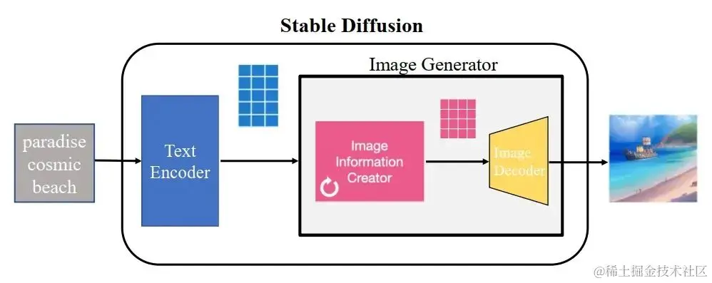 最左侧是提示词:paradise cosmic beach,提交到 Stable Diffusion 之后,它首先通过 Text Encoder 把提示词编码为一组带有文字语义的向量(向量可以理解成1位数组),然后把这组向量投递给一个图片生成器( Image Information Creator),图片生成器根据向量的值来构建出相应语义的图片信息,这些信息还不是我们常见的图片格式,然后还需要 Image Decoder 进行图片解码处理,转换为PNG图片格式,就是肉眼可见的了。