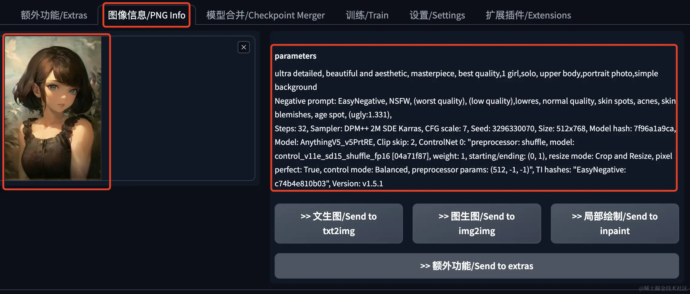 Stable Diffusion WebUI中集成了一个查看图片提示词的工具,我们只要在“图像信息”这里上传一张图片,页面的右侧就会自动显示生成这张图片时的一些参数。不过这个生成信息是可以被抹除的,遇到了也不要惊讶。