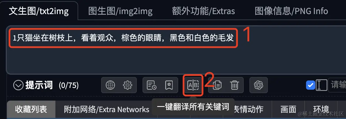 在下图1的位置输入中文关键字,键盘回车之后,就会把关键字填写到提示词输入框中,并自动翻译为英文。