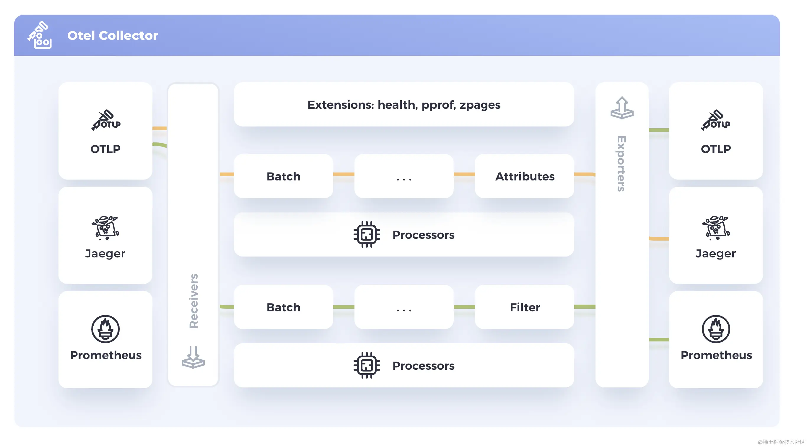 Processor 和 Exporter 功能与 OpenTelemetry SDK 中的 Processor 和 Exporter 功能类似,但是 Collector 作为独立的进程,可以集中处理多个应用程序的数据(如通过 OTLP 的 Receiver 进行统一的收集),而不需要在每个应用程序中都集成 Processor 和 Exporter。