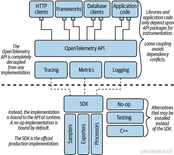 虚线的上方是 OpenTelemetry API 的定义,下面是具体的 SDK 实现。