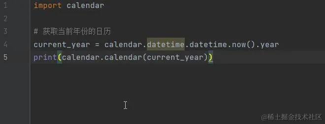 下面是一个简单的示例代码,演示了如何使用calendar模块获取当前年份的日历: