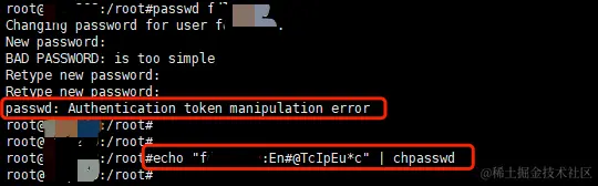 使用echo "test:En#@TcIpEu*c" | chpasswd这个命令设置用户密码即可,test是用户名,冒号后面的是密码。
