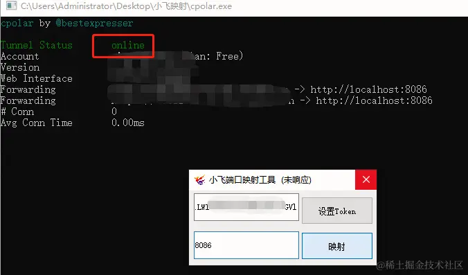 打开软件(小飞映射.exe),第一个输入框填写之前复制的Token,填写完成点击设置Token,第二填写需要映射的端口,填写完成点击映射。