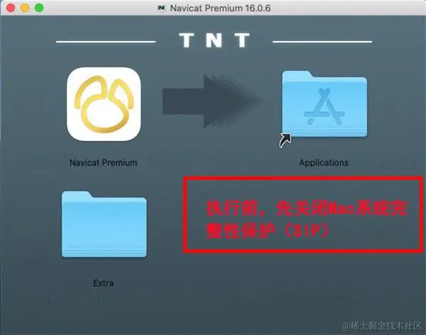 Navicat 16 (Mac版)使用教程 猿份天空 2023-11-17 764 阅读1分钟 安装教程 1、下载得到navicat 16 MacOS.dmg压缩 2、解压后,如下图所示:将左侧的【Navicat Premium 】拉到右侧应用程序中 3、软件拷贝中,请耐心等待完成 4、进入应用程序,navicat 16已经集成破解补丁,双击运行即可打开软件,破解完成